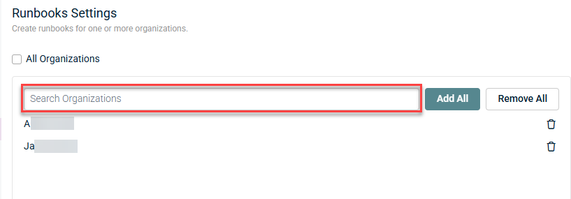 - Navigate to Admin > Runbooks. In Runbook Settings, start typing to search for organizations and sub-organizations.