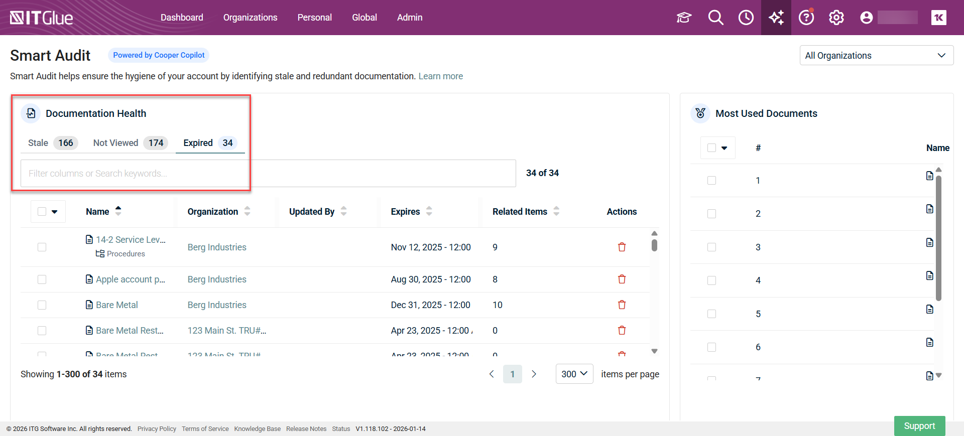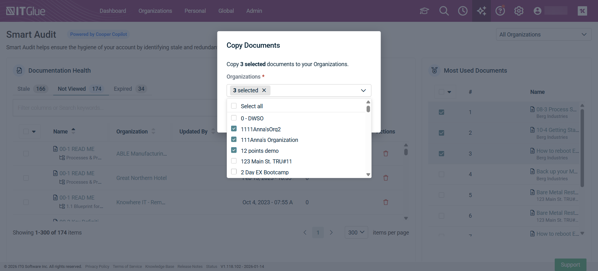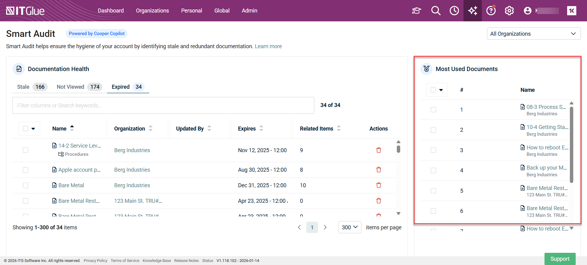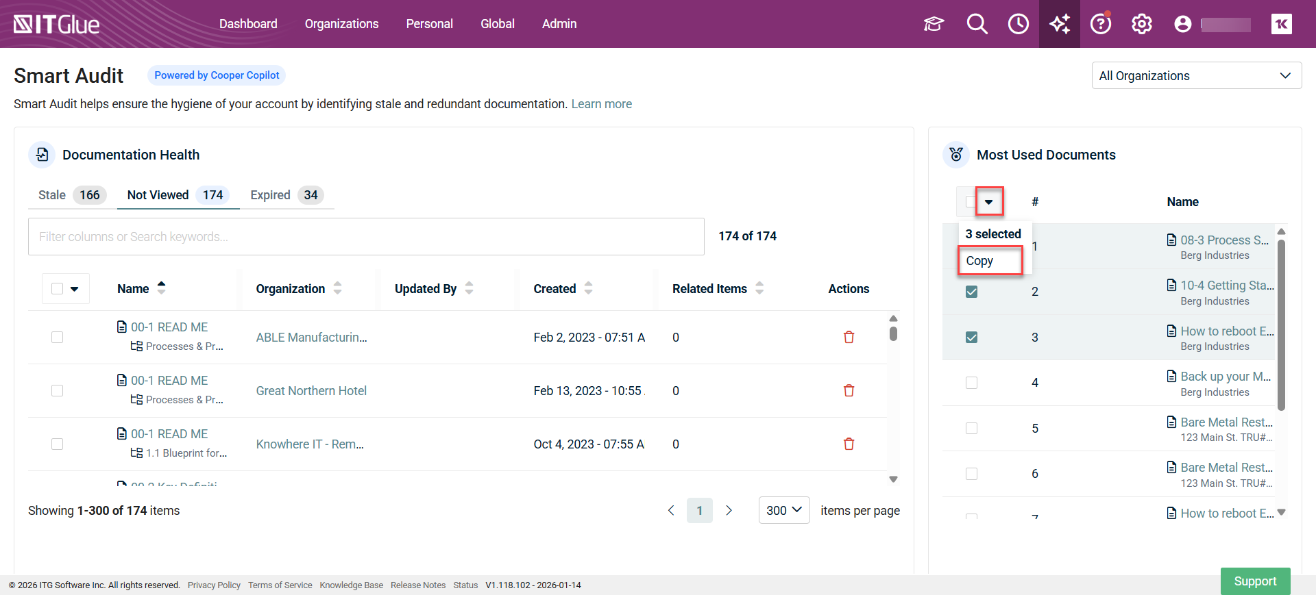Smart Audit by Cooper Copilot enhances IT Glue's documentation management by providing a dedicated section to identify and clean up stale and redundant documents and maintain an efficient workspace.