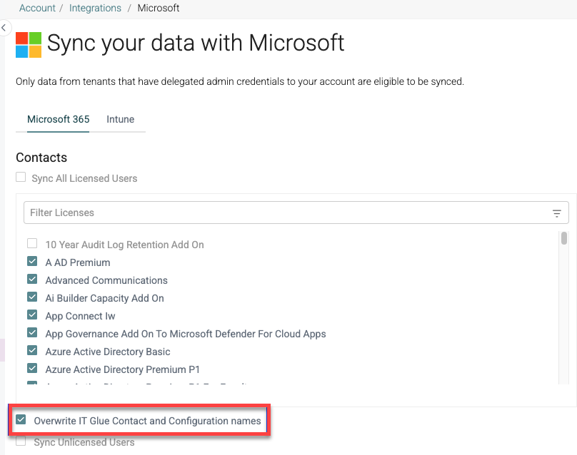IMPORTANT IT Glue Contacts and Configuration names will not get overwritten by the Microsoft integration, unless you check the setting Overwrite IT Glue Contact and Configuration names. In this case , Contact and Configuration names from Microsoft will propagate to IT Glue.