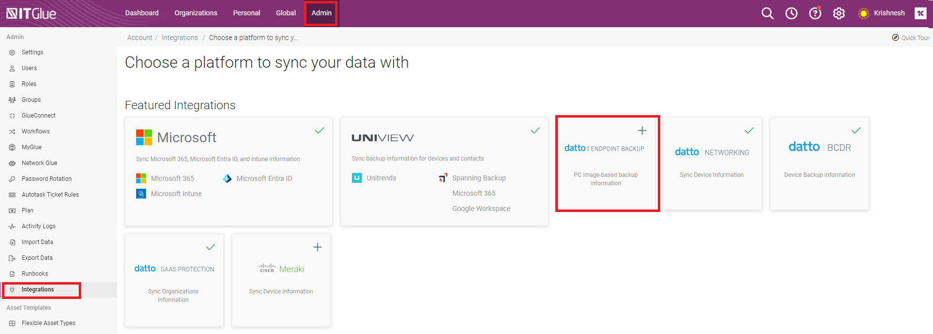 Log in to IT Glue and navigate to Admin > Integrations. Then, click on the green + New button and then on the Datto Endpoint Backup icon.