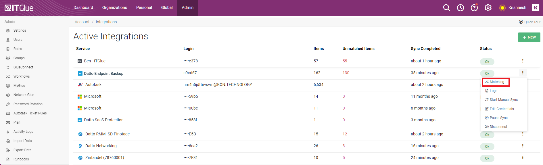 IT Glue discovers organizations and configurations and tries to match them to data in your account. Anything that is not automatically matched will need to be manually actioned. For Datto Unified Backup, we will be matching based on the name of the organization in IT Glue and the organization name in Datto Unified Backup.