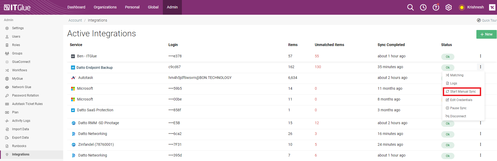 In the Integrations page, the sync will be automatically queued. By default, newly queued syncs are scheduled one hour later. To start the sync immediately, click Actions > Start Manual Sync.