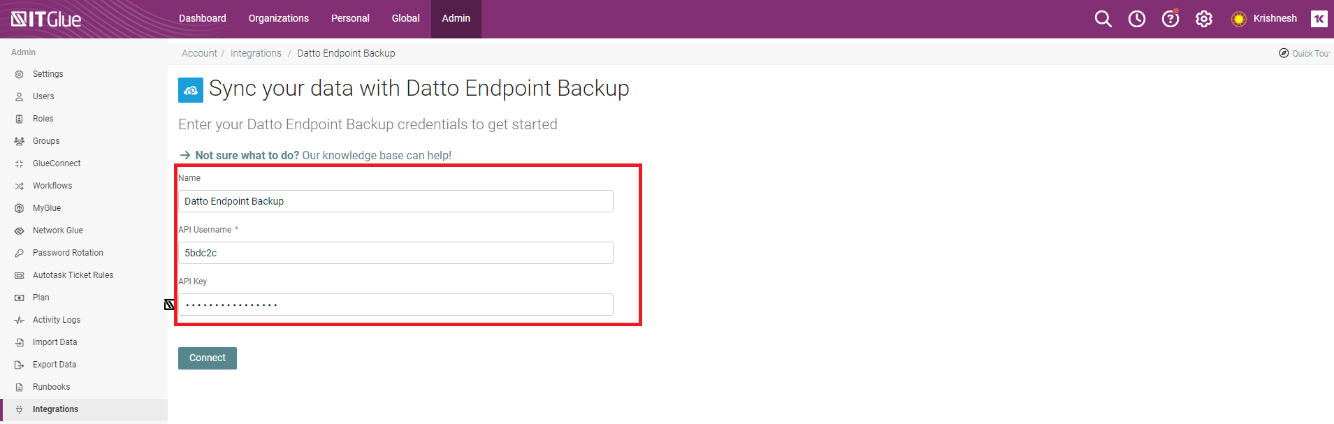 Enter the REST API Public Key into the API Username field in IT Glue and the REST API Secret Key into the API Key field, then click Connect.