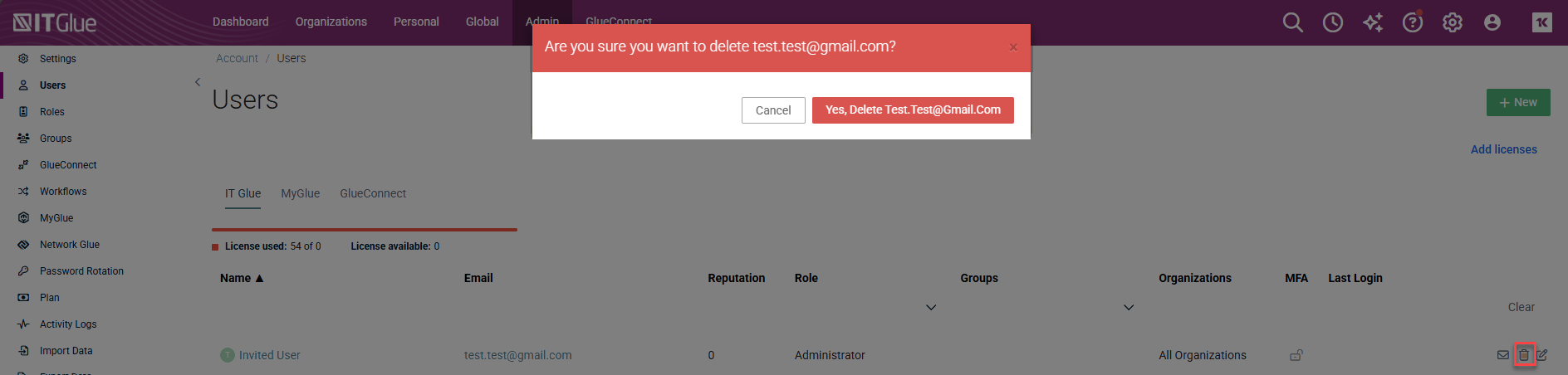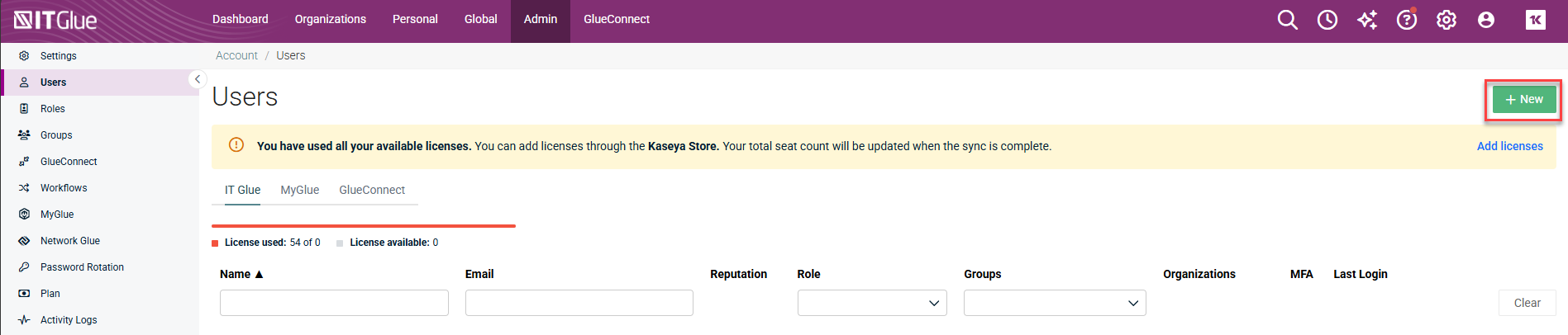 - Navigate to Admin > Users > IT Glue.