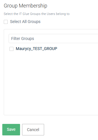 Select the IT Glue groups the user will be a member of and the organizations they can access, if not already populated by a group. Organization names populated by a group are grayed out because the permissions are inherited.