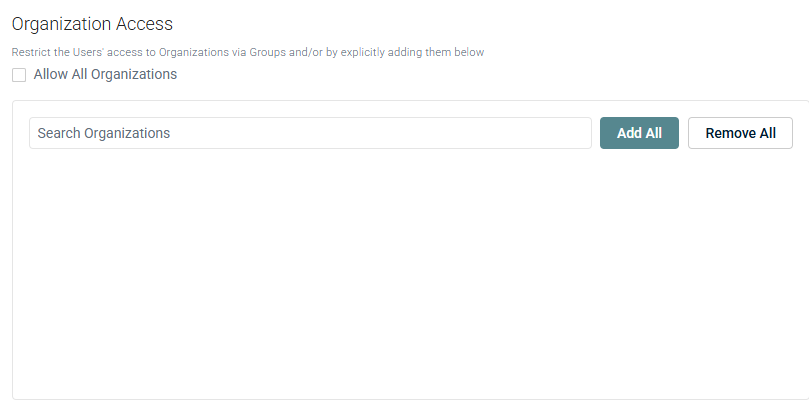 IMPORTANT Each user must have access to at least one organization. Select the Allow All Organizations check box if you want to give the user access to all current and future organizations.