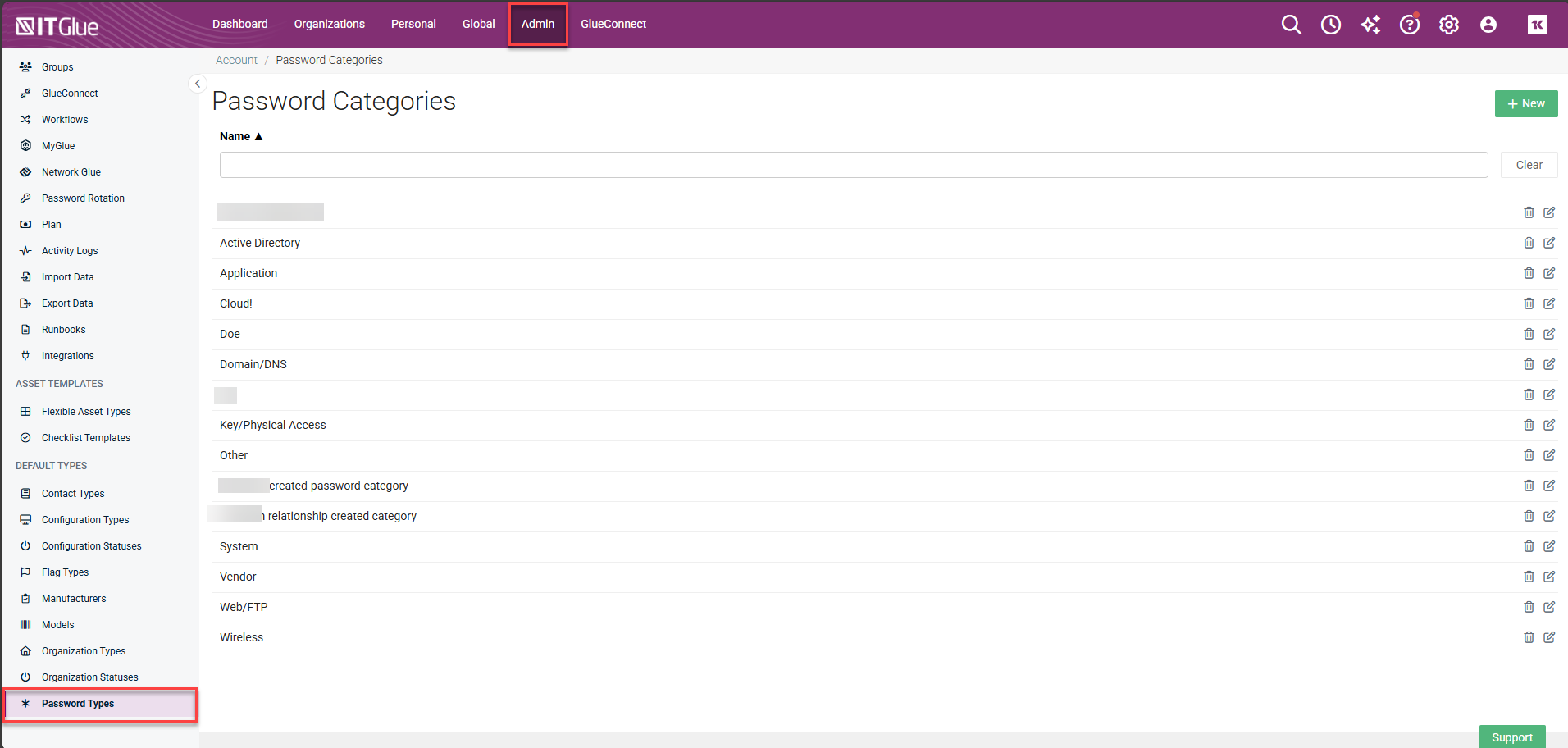- Log in to IT Glue and navigate to Admin > Password Types where you can review the password types available in your account. If you already have a well established set of categories you use to organize passwords, you can edit the types to reflect your existing categories.