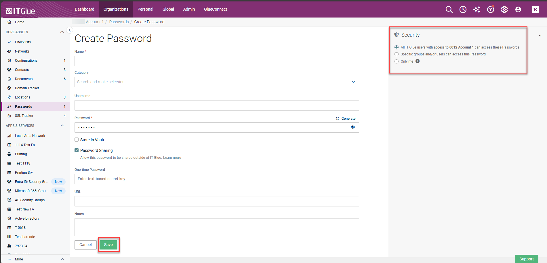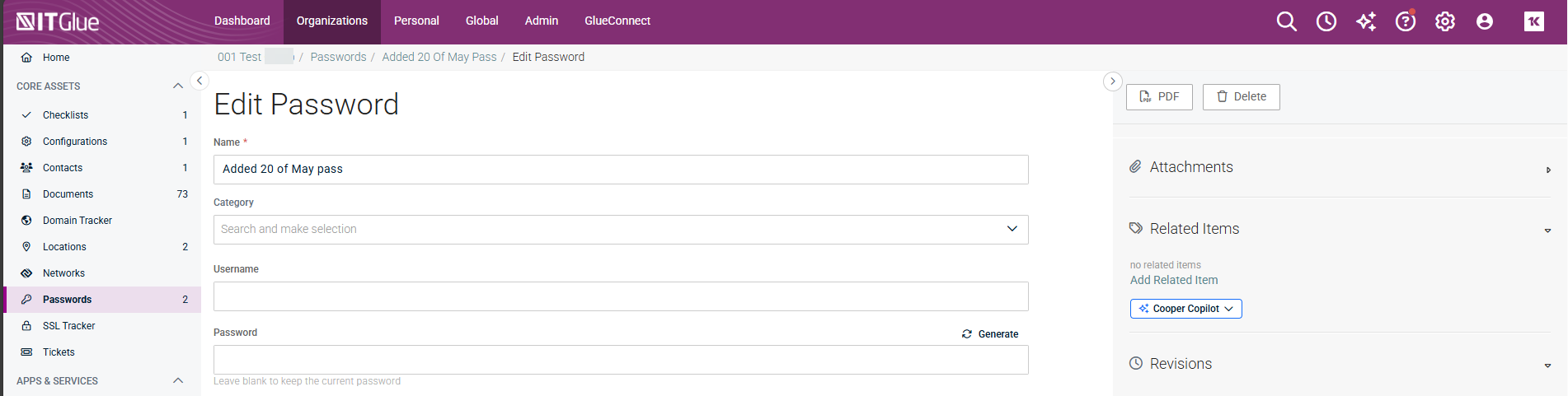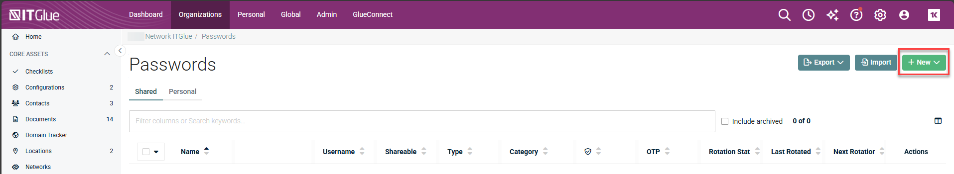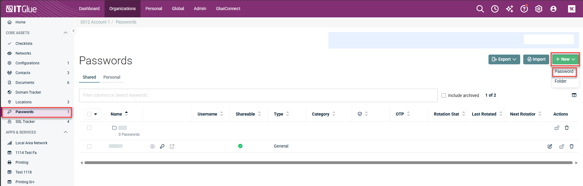 - Log in to IT Glue and navigate to Organization > Passwords.