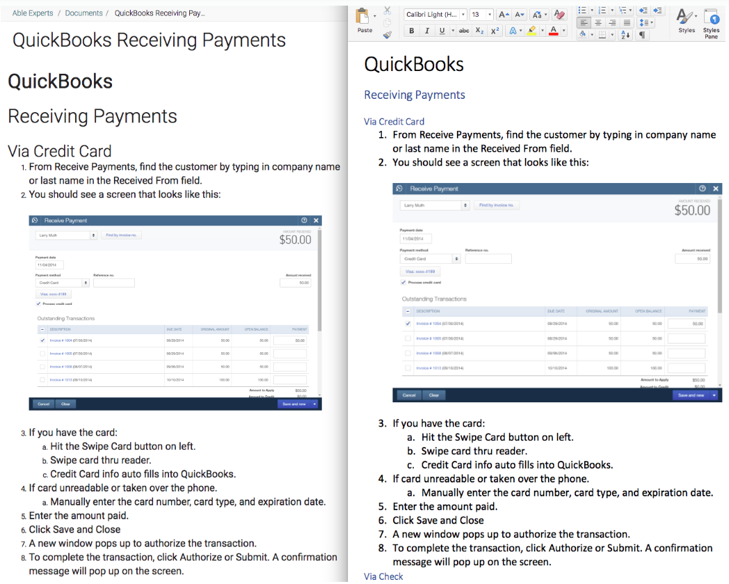 EXAMPLE The IT Glue document (left) compared to the original Word document (right)