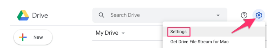 - Log in to Google Drive, click on the cogwheel icon, and then on Settings.