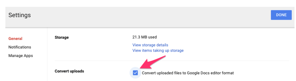 - Click on the checkbox for Convert uploaded files to Google Docs editor format.