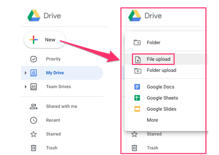- Upload your documents that include numbered lists into this folder. Click + New at the top-left of the screen and click File upload, or drag and drop the documents into the folder. This will automatically convert the documents into the Google Docs format.