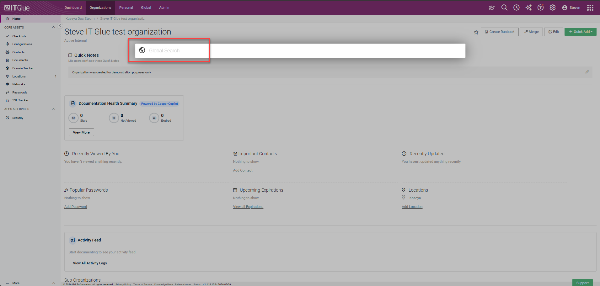 - If you begin your search outside of an organization, IT Glue Search defaults the search to a global level only. This means you are searching information from across all organizations you have access to.