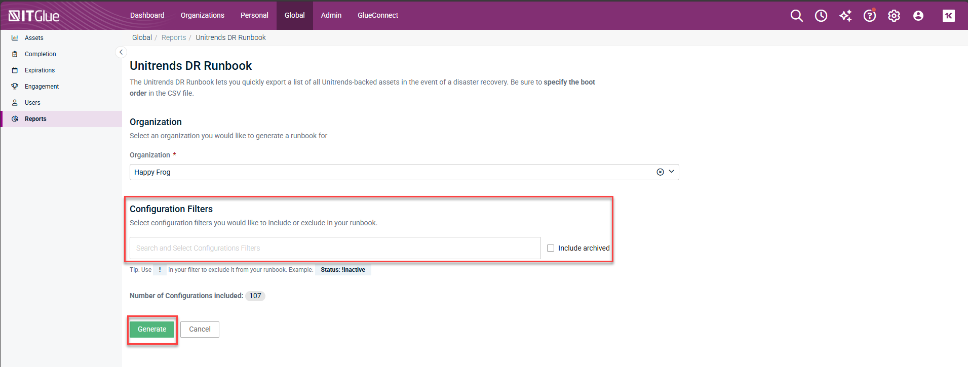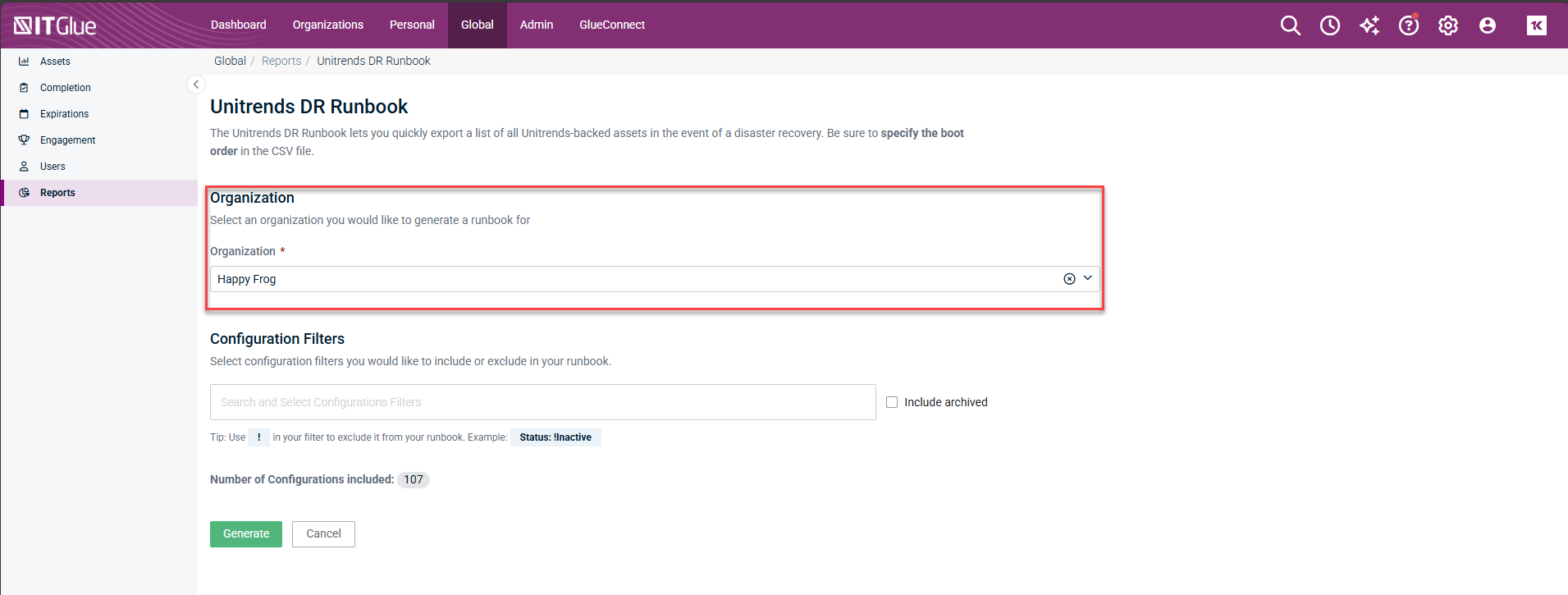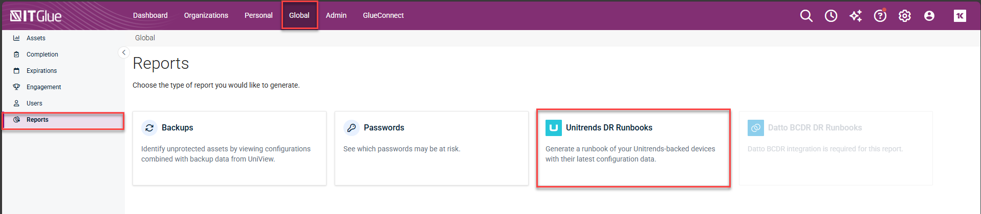 - In IT Glue, navigate to Global > Reports and click Unitrends DR Runbook. If your IT Glue account does not have an integration setup with Unitrends MSP yet, this icon will be greyed out.
