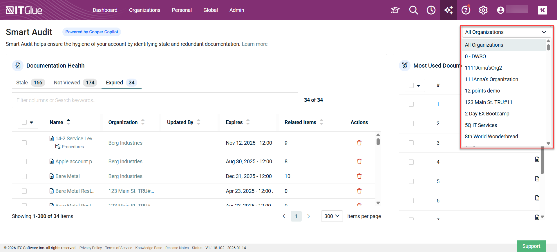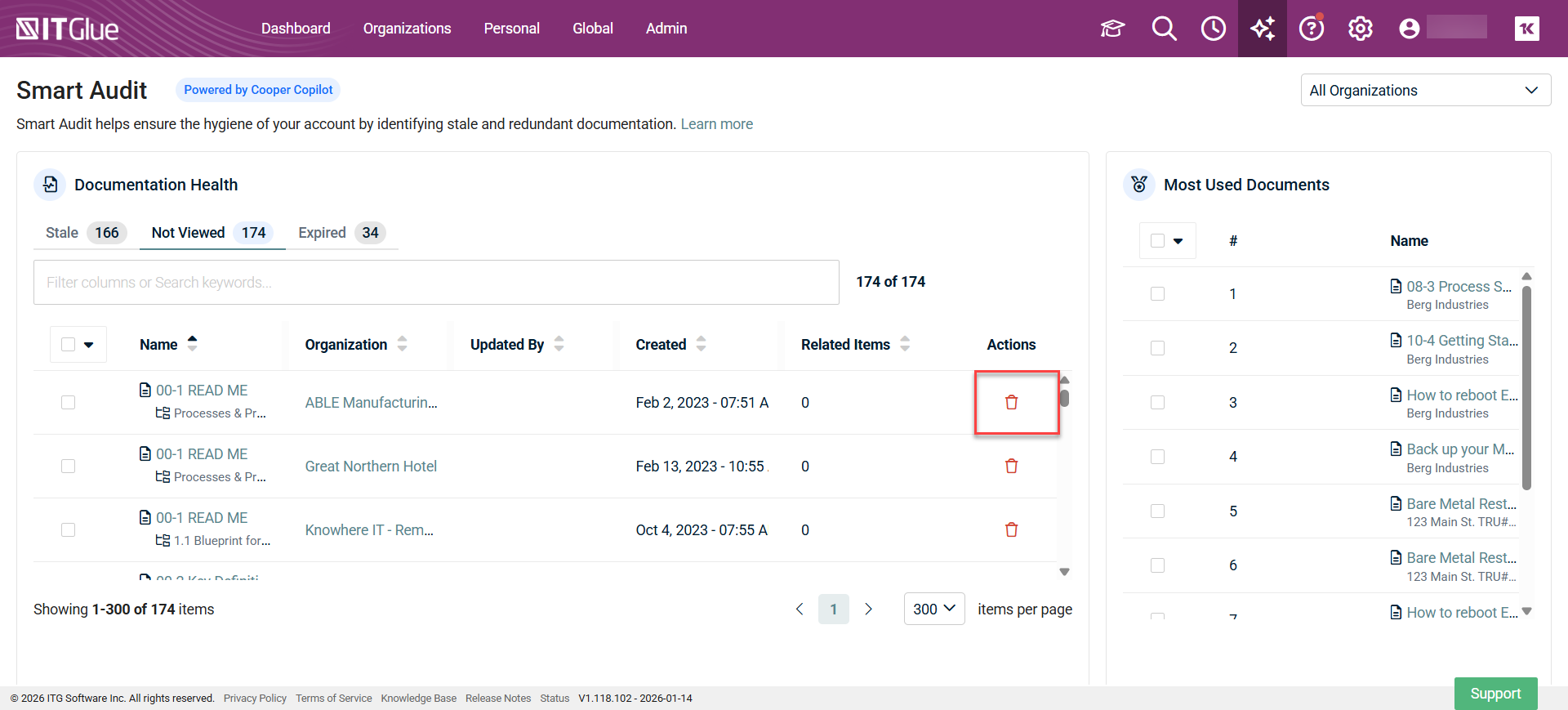 Smart Audit by Cooper Copilot enhances IT Glue's documentation management by providing a dedicated section to identify and clean up stale and redundant documents and maintain an efficient workspace.