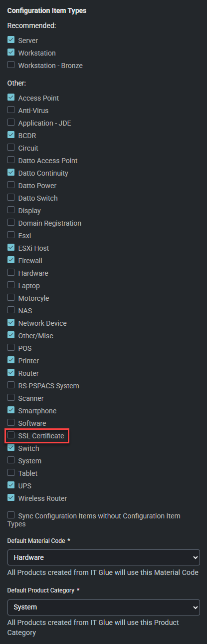 *Manufacturers and models are created in IT Glue if they don't already exist. For a list of the manufacturers and models created in IT Glue, navigate to Admin and click the relevant option in the Default Types section of the left navigation menu.