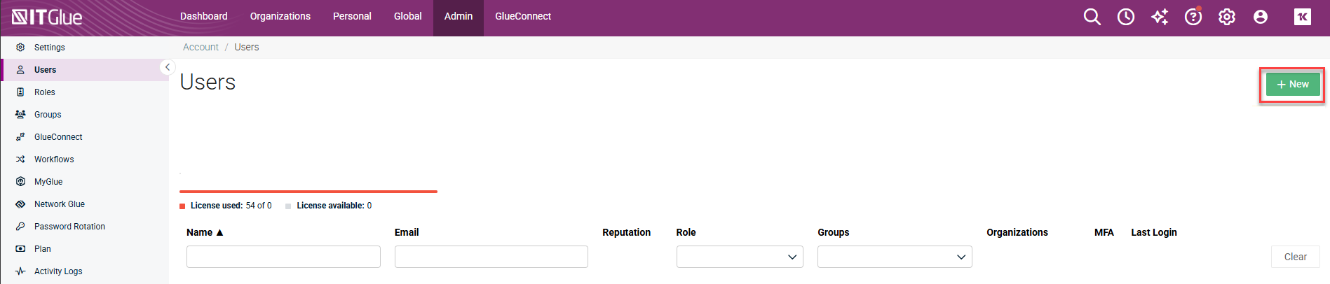 - Navigate to Admin > Users > IT Glue.