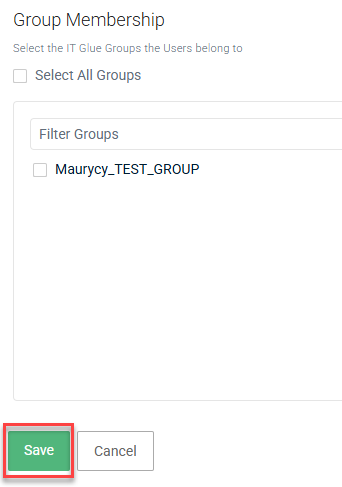 Select the IT Glue groups the user will be a member of and the organizations they can access, if not already populated by a group. Organization names populated by a group are grayed out because the permissions are inherited.