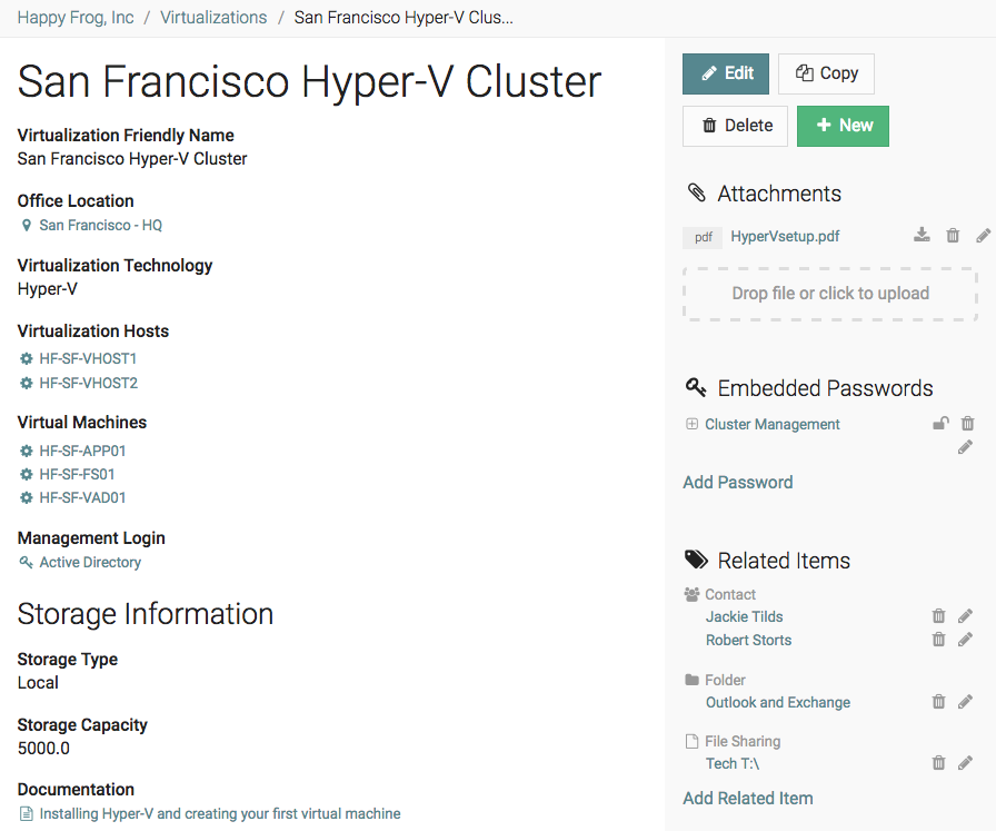 - Use the Attachments and Related Items sections to add long form documentation. Consider creating a document with advanced configuration details or adding new fields to the flexible asset to record additional details, such as: