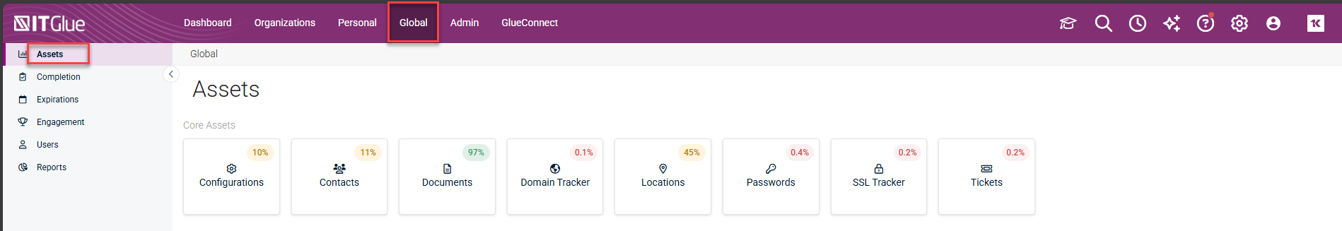 Clicking on the plus signs or the numbers in the list will take you to that specific area of IT Glue so you can view or document the information.