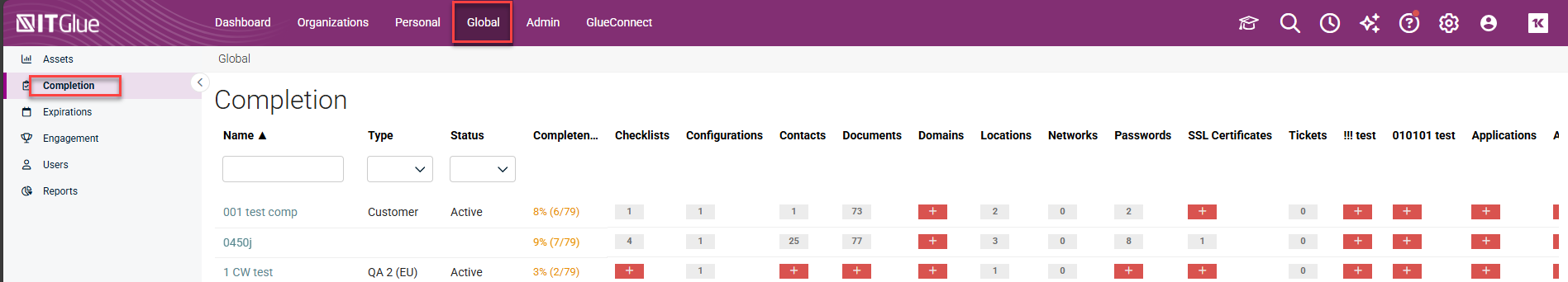 You can use the Completion area to get a high-level view of your team's progress on projects. For example, as you onboard new clients, use this section to determine what still needs to be documented.