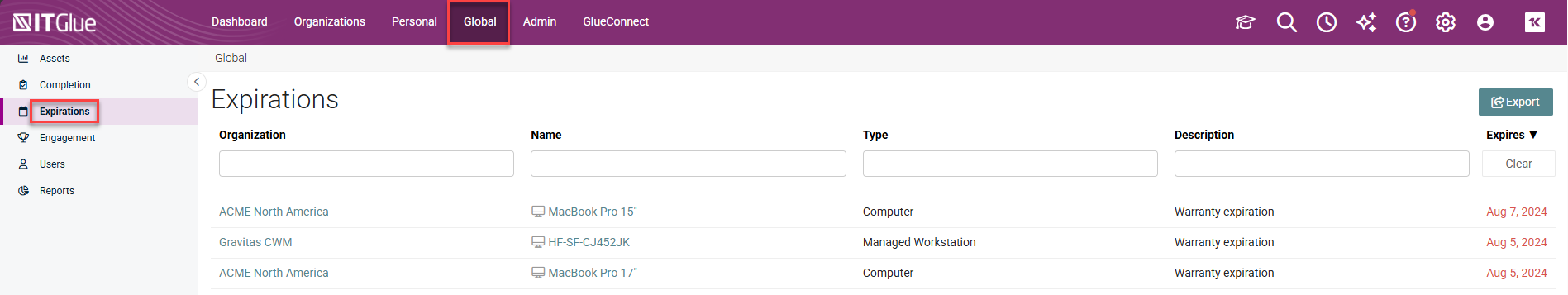 For example, if you create a document about setting up a type of device that is associated with multiple clients, you can go to Global > Assets to see where these devices are located. Clicking on a device's name will open the item in IT Glue, so that you can view and edit information as well as perform tasks like adding related items.